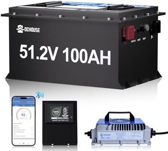 The battery includes a smart 200A BMS (battery management system) that supports high peak currents for hill climbing and also connects to your phone via Bluetooth for monitoring. A touch screen monitor is also included for easy status checks while driving. It comes with an 18A charger and a retention strap, making it easier for DIY installation. The battery weighs about 88 pounds, which is lighter than many lead-acid alternatives but still requires some effort to handle. The ABS case is fireproof, shockproof, and waterproof (IP65), enhancing safety and reliability. Charging is efficient thanks to an automatic voltage equalizer that helps maintain battery health over time.