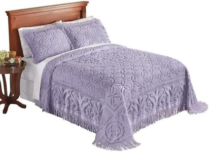 The Beatrice Home Fashions Medallion Chenille Bedspread in Queen size delivers a charming vintage look with its distinctive large medallion and scroll design, complemented by fringed hems and bell corners that add elegance to any bedroom. Made of 100% cotton chenille, it offers a soft and comfortable texture typical of this fabric, though you may notice some shedding of small fibers at first, which is normal due to how chenille is made.