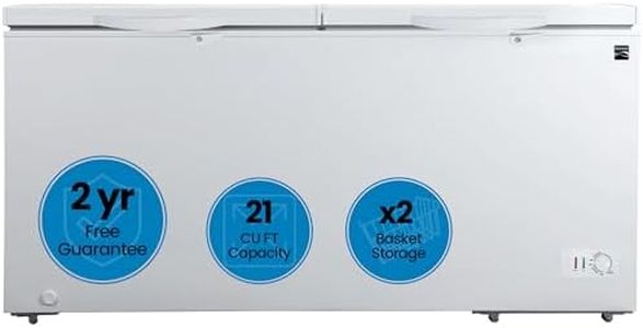 The Hamilton Beach HBFRF2129 is a spacious chest freezer with a 21 cubic feet capacity, making it suitable for large families or anyone needing plenty of storage for bulk groceries, hunting supplies, or meal prep. Its double-door lid design allows easier access to stored items, which is a handy feature in a large unit. The freezer is designed to be garage-ready, meaning it should tolerate a wider range of temperatures found in garages, adding to its versatility.