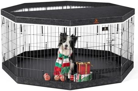 The Amazon Basics Foldable Octagonal Metal Exercise Dog Playpen is designed for both indoor and outdoor use, providing a spacious 16-square-foot enclosure. It is suitable for dogs up to 26 inches tall and features 8 connected panels measuring 24 x 42 inches each. The panels are made of durable iron wire with a rustproof finish, ensuring longevity. The playpen's height of 42 inches helps to keep energetic pets securely contained.