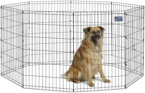 Being made of plastic, it may not be as sturdy as metal options and might not withstand very aggressive chewers. The white color might show dirt more easily, requiring frequent cleaning. This playpen is ideal for those looking for an adaptable, easy-to-assemble solution to keep their medium to large dogs secure in a designated area.