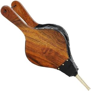 The Kerykwan Fireplace Bellows is a large-sized air blower measuring 17”x7.5”. It is constructed from solid wood with a powder-coated finish, zinc-cast nozzle, and heat-resistant leather, making it both durable and attractive. The design is traditional and rustic, which can enhance the decor of any wood-burning fireplace setting.