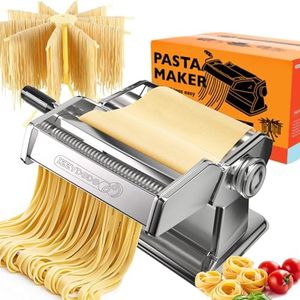 The MZTOGR Pasta Maker Machine with a pasta drying rack is a comprehensive set designed for pasta enthusiasts. Made primarily of stainless steel, it ensures durability and resistance to corrosion. The machine includes two blades and a ravioli cutter, allowing you to make various types of pasta such as fettuccine, spaghetti, and ravioli. The adjustable dough roller offers 9 thickness settings, adding versatility to your pasta-making experience.