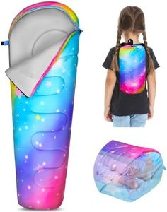 The Bollepo Space Sleeping Bag is a kid-friendly option designed for children aged 3 to 12, measuring 66 by 33 inches, which suits kids up to 5 feet tall. Its rectangular shape provides ample room for comfort. It features polyester fill with a soft cotton interior and a durable polyester exterior, balancing a gentle feel with lasting durability. This construction makes it suitable for everyday camping or sleepovers.