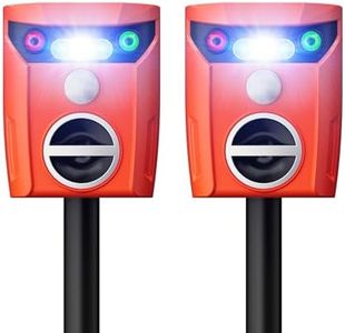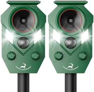This ultrasonic deer repeller set includes two devices designed to keep a variety of animals such as deer, raccoons, squirrels, and cats away from your garden or yard. It uses motion sensors to detect movement up to about 26 feet, then emits ultrasonic sounds along with flashing LED lights to scare animals off without disturbing people nearby. Both the detection range and ultrasonic frequency are adjustable, which allows targeting specific animals effectively.