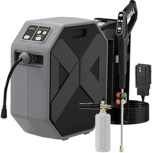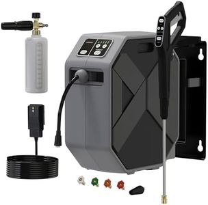 The Giraffe Tools Grandfalls Retractable Pressure Washer Pro is a strong contender in the wall-mounted electric pressure washer category. It boasts a powerful 1800W brushless motor that offers quiet operation and better durability compared to traditional motors, making it a good choice for frequent or heavy-duty use. With a high pressure rating of 3700 PSI and a flow rate of 1.6 GPM, it can handle tough grime and dirt effectively, suitable for cleaning cars, patios, and other household surfaces. The long 100-foot hose provides excellent reach, giving you plenty of flexibility without needing to move the unit frequently. It comes with four quick-connect nozzles (0°, 15°, 25°, 40°) that let you adjust the water spray depending on the cleaning task, plus a foam cannon for easy detergent application which helps with washing vehicles or outdoor furniture more thoroughly.