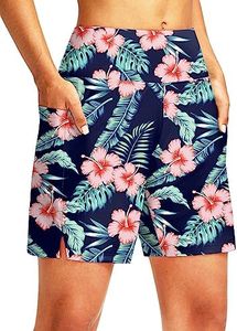 The shorts come with a high-waisted tummy control design and an elastic waistband, ensuring a flexible fit and additional support for the waist area. The built-in swim brief liner adds extra comfort and support, making these shorts suitable for extended wear without discomfort. The 5-inch inseam offers moderate coverage, and the deep side pockets, along with a waist stash pocket, provide convenient storage for small items such as keys or cards.